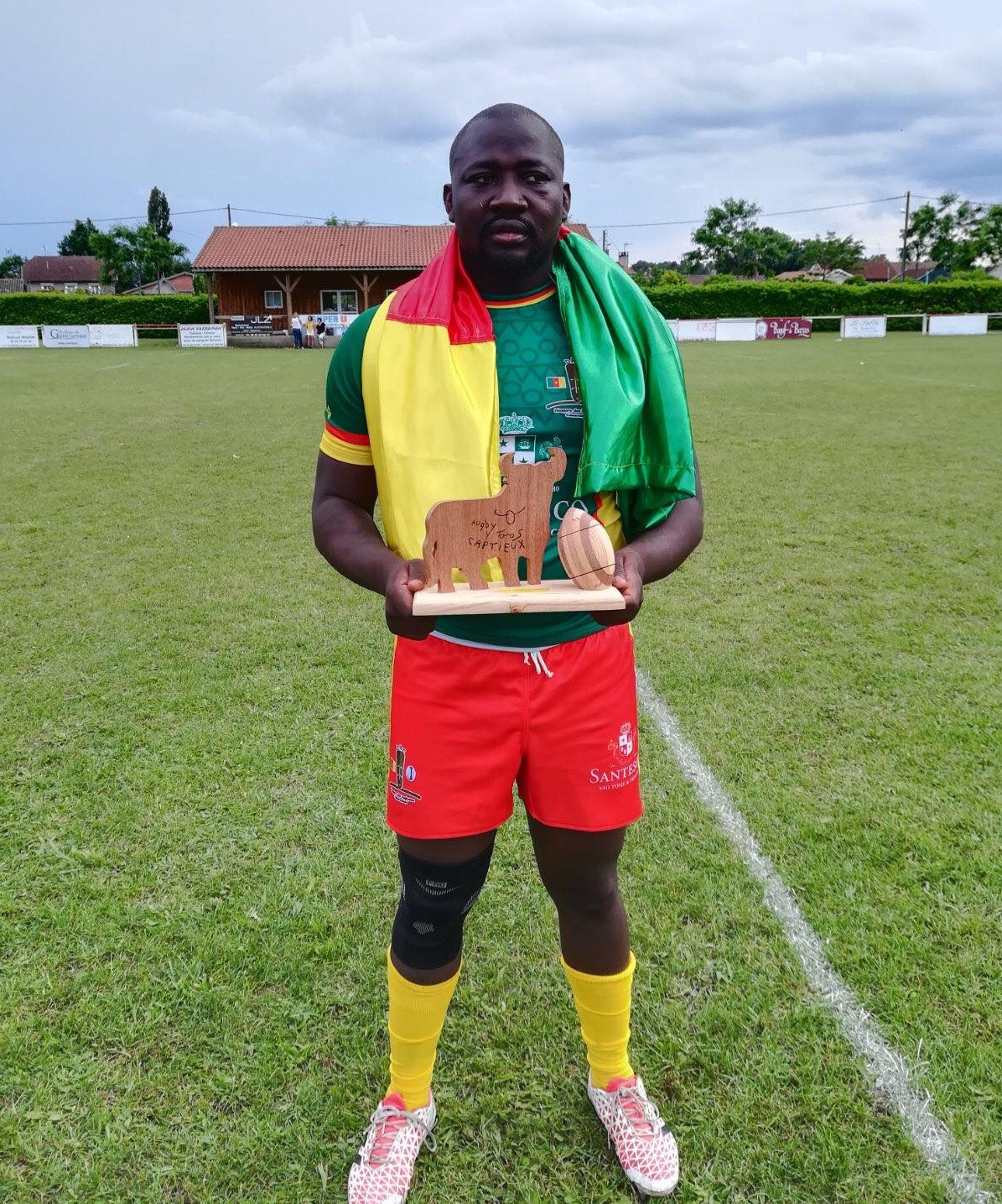 | François Lindjeck, Capitaine de la Diaspora des Rugbymen Camerounais, avec le trophée Rugby Y Toros / Captieux |